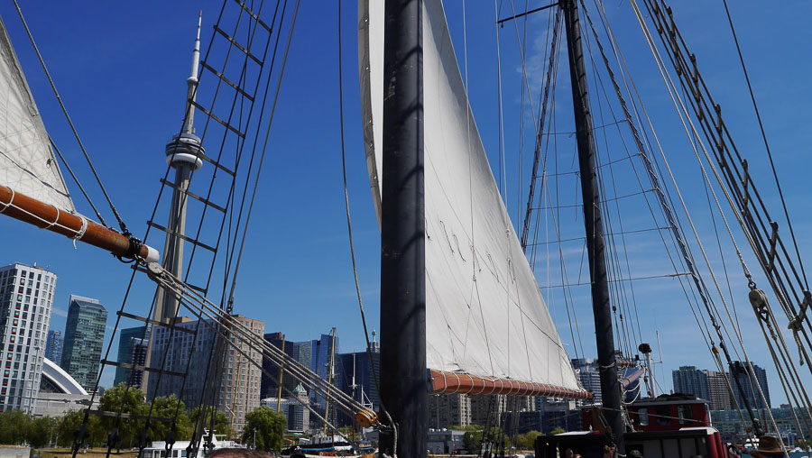 Der Skipper stimmt ein Shanty an und seine Mannschaft stimmt ein, während sie die Segel setzen. Ja, ich darf sogar mithelfen, die schweren Taue anzuziehen und beim auf-achtern dabei zu sein. Seefahrer-Stimmung kommt auf, das Schiff schaukelt leicht und die kleinen Wellen klatschen an den Bug. Jetzt knattern die braunen Segel im doch recht kräftigen Wind und ziehen das Schiff hinaus. Der alte Kahn hat schon einiges auf dem Buckel und hat eine wechselvolle Geschichte erklärt mir Sarah, die hier als Studentin mithilft in der Crew. 1940 wurde das Segelschiff in Deutschland gebaut, nach dem Krieg ging es an eine dänische Familie, die es als Transportschiff nutzte, bevor es 1999 endlich zu seiner wohl letzten Aufgabe als kurioses Ausflugsschiff für erlebnishungrige Ausflügler diente, die in einer zweistündigen Tour rund um Toronto-Island fahren und einen atemberaubenden Blick auf die Skyline von Toronto genießen möchten.