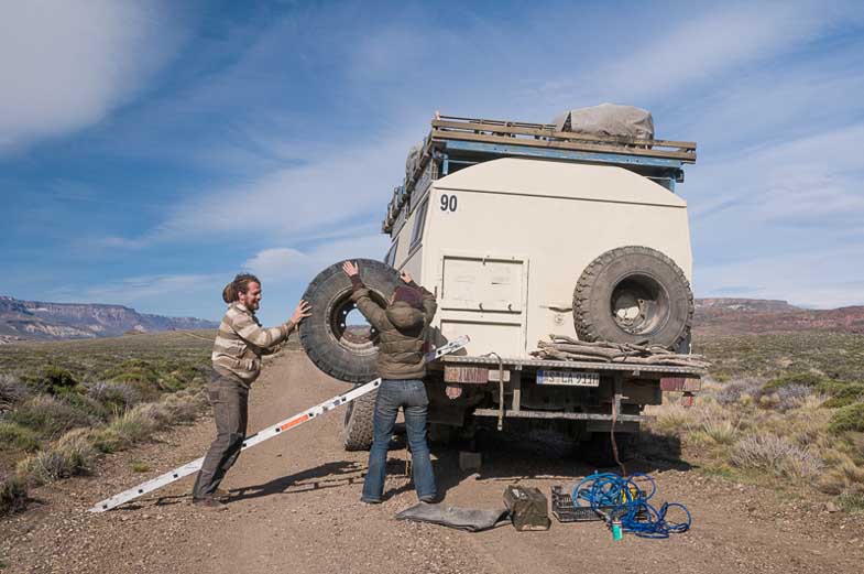 | Dass diese Art zu Reisen auch seine Herausforderungen in sich birgt, lernten wir schnell: bereits den dritten Reisetag verbrachten wir auf Schrottplätzen auf der Suche nach einem noch funktionierenden Anlasser, füllten täglich Motoröl nach und konnten nach der fünften Woche das Fahrzeug nur noch durch Anschieben starten. |