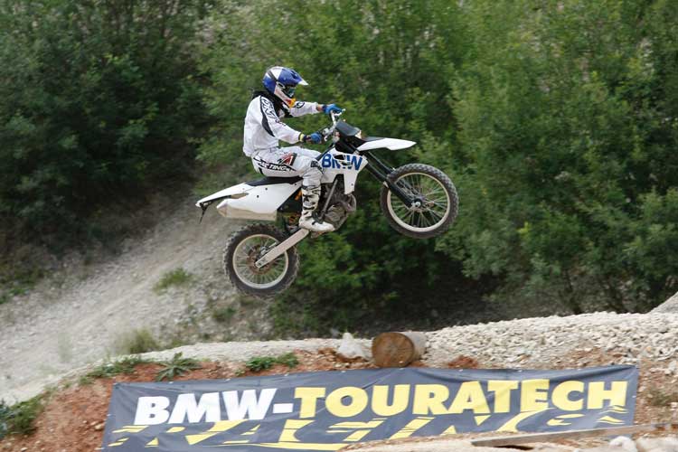 Während die Teilnehmer in Ruhe ihr Bier trinken, zeigt Profi Bernd Eckenbach, was er mit der BMW G 450 X so alles anstellen kann.
