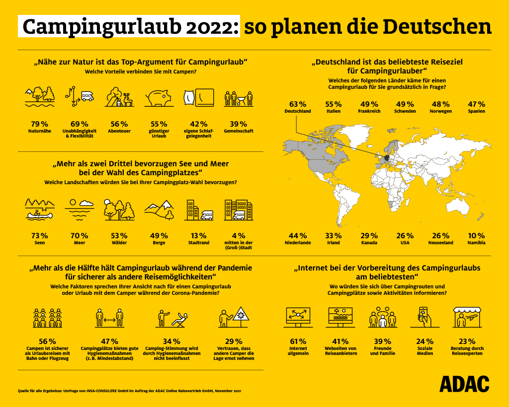 Für welche Region und welche Route sich Camper auch entscheiden: Das Campertool ADAC Reisen unterstützt die Urlauber bei ihrer individuellen Reiseplanung. Eine Infografik rund um das Thema "Campingurlaub 2022: So planen die Deutschen" sowie ein Code zum Einbetten finden Sie unter ADAC Reisen Infografik .