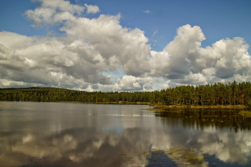 Einen anderen Bewohner der Wälder suche ich in diesen Tagen vergeblich. Ist doch der Elch, oder Moose, wie er in Schweden genannt wird, eines der Nationaltiere dieser Tage, so scheint er mir trotz intensiver Suche verborgen zu bleiben. Kreuz und quer fahre ich in der Dämmerung durch die Wälder, achte auf die Zeichen, an denen man die Elchspuren erkennen kann – etwa abgefressene Äste junger Bäume, vor allem auf kahlgeschlagenen Lichtungen - und treffe dennoch nur auf Hufabdrücke dieses scheuen Tieres. Ich höre Geschichten über Elch-Begegnungen, von seltenen, weißen Elchen, von solchen die in Unfälle verwickelt sind oder in Gärten Tulpen stehlen. Der Unmut, dass ich nun keines dieser Tiere mit seinen schaufelartigen Geweihen sehe, wächst. Was war geschehen? Wo sind die Tiere dieses Waldes? Die Antwort finden wir untwerwegs. Es ist Bärenjadgzeit und eine Gruppe norwegischer Bärenjäger sitzt mitten im Wald um das Lagerfeuer herum. Sie haben noch keinen Bären gefunden, aber schon mit ihren Hunden den ganzen Wald durchkämmt – und damit das ganze Wild vertrieben. Doch dann fährt es plötzlich wie der Blitz durch meine Augen. War da nicht etwas braunes unterhalb der Straße im sumpfigen Grün zwischen den Bäumen? Tatsächlich - auf den ersten Blick kaum zu erkennen stehen hinter einem Baum geschützt zwei kleine Elche. Sie wittern mit ihrer untrüglichen Nase den Menschen sofort und suchen das Weite. Aber, ich kann an diesem Abend stolz erklären, auch ich hatte mein schwedisches Elch-Erlebnis – wenn auch nur ein Kleines.