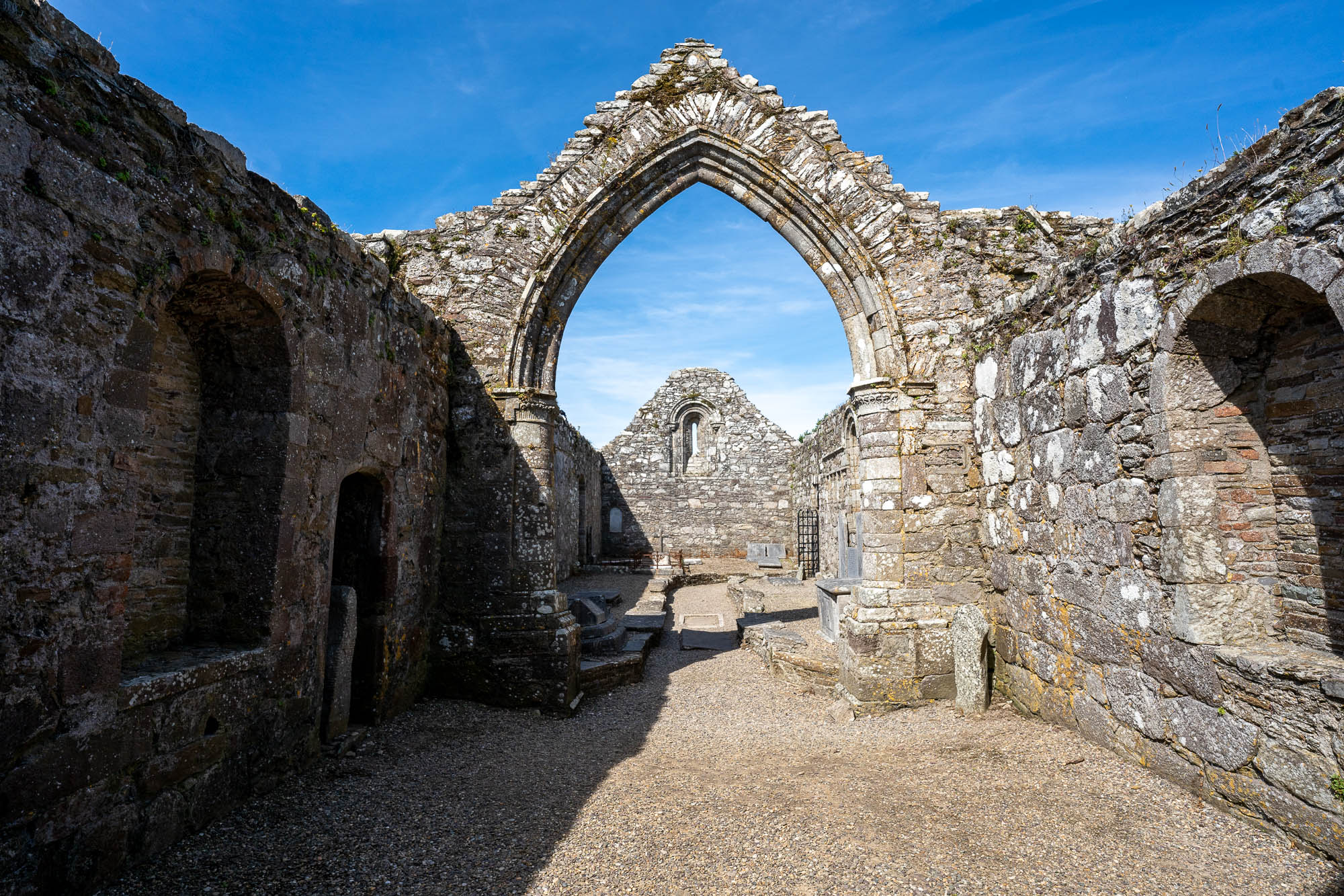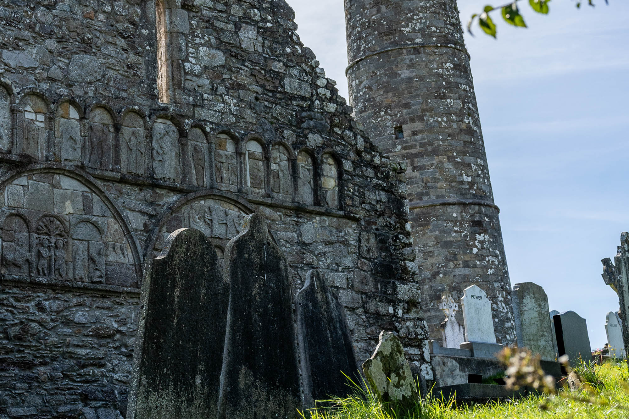 Es sind die Überbleibsel einer romanischen Kirche, die mit dem Rundturm zu den bedeutendsten ihrer Art gehört. Moel-Ettrim Ó Duibh-rathra ließ sie 1203 errichten und soweit man weiß, wurden die Reste einer noch älteren Kirche integriert. Die Szenen oberhalb einer Reihe kleiner Bögen sind abgebröckelt, aber der Erzengel Michael, der die Seelen wiegt, kann erkannt werden. Unterhalb der großen Arkadenbögen sind Adam und Eva, das Gericht Salomos und die Anbetung der Weisen erkennbar.