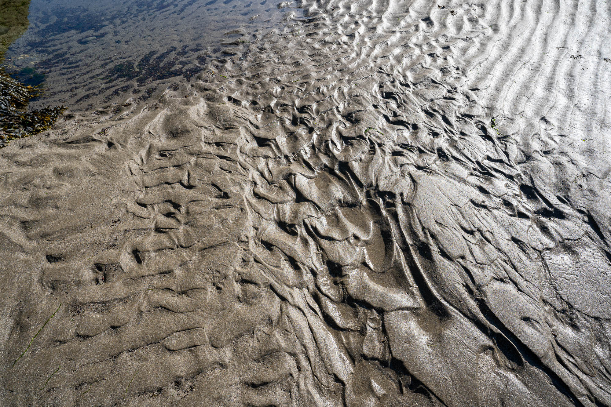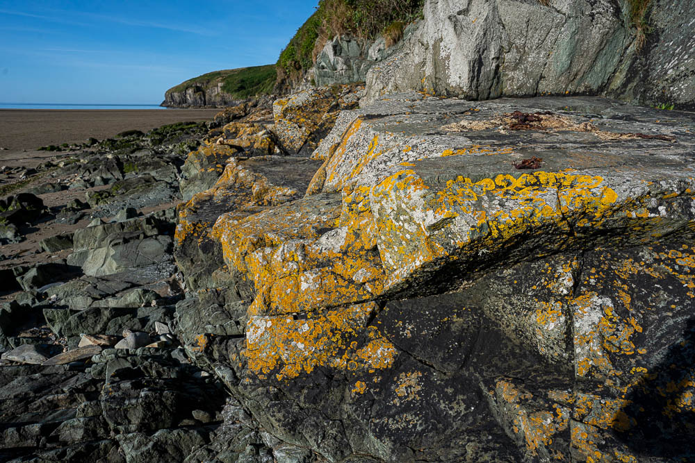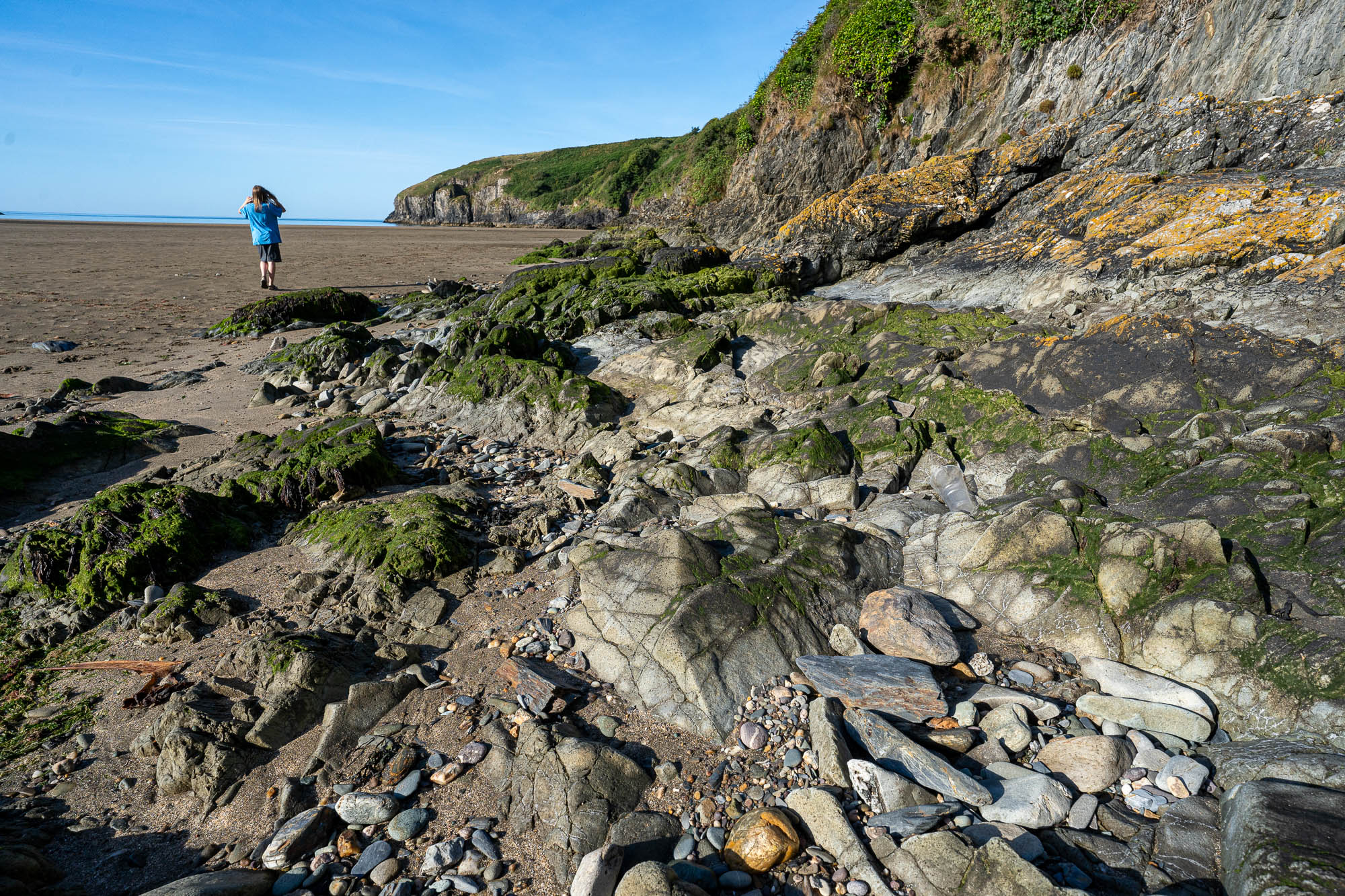 An der „Copper Coast“ (Namensgeber sind die Kupferminen, die es hier gab), wo der Tay durch ein sandiges Flussbett seinen Weg zum Meer findet, wird unsere Suche belohnt. Wir haben unser erstes Wild Camp in Irland gefunden, in einer Bucht direkt am Meer, windgeschützt von Hügeln auf beiden Seiten. Als wir ankommen ist gerade Ebbe und das Meer hat sich zurückgezogen. Der Strand einige hundert Meter weit weg. Auf dem Weg dorthin laufen wir an skurril geformten Felswänden vorbei und auf einer Info-Tafel können wir lesen, was dieser Teil Irlands einstmals war: Ein Meeresgrund in der Nähe des Südpols; ein Vulkan, der durch den Meeresboden brach und eine von Gletschern geformte Landschaft. Und das vor 460 Millionen Jahren, als die Kontinente noch zusammen klebten.