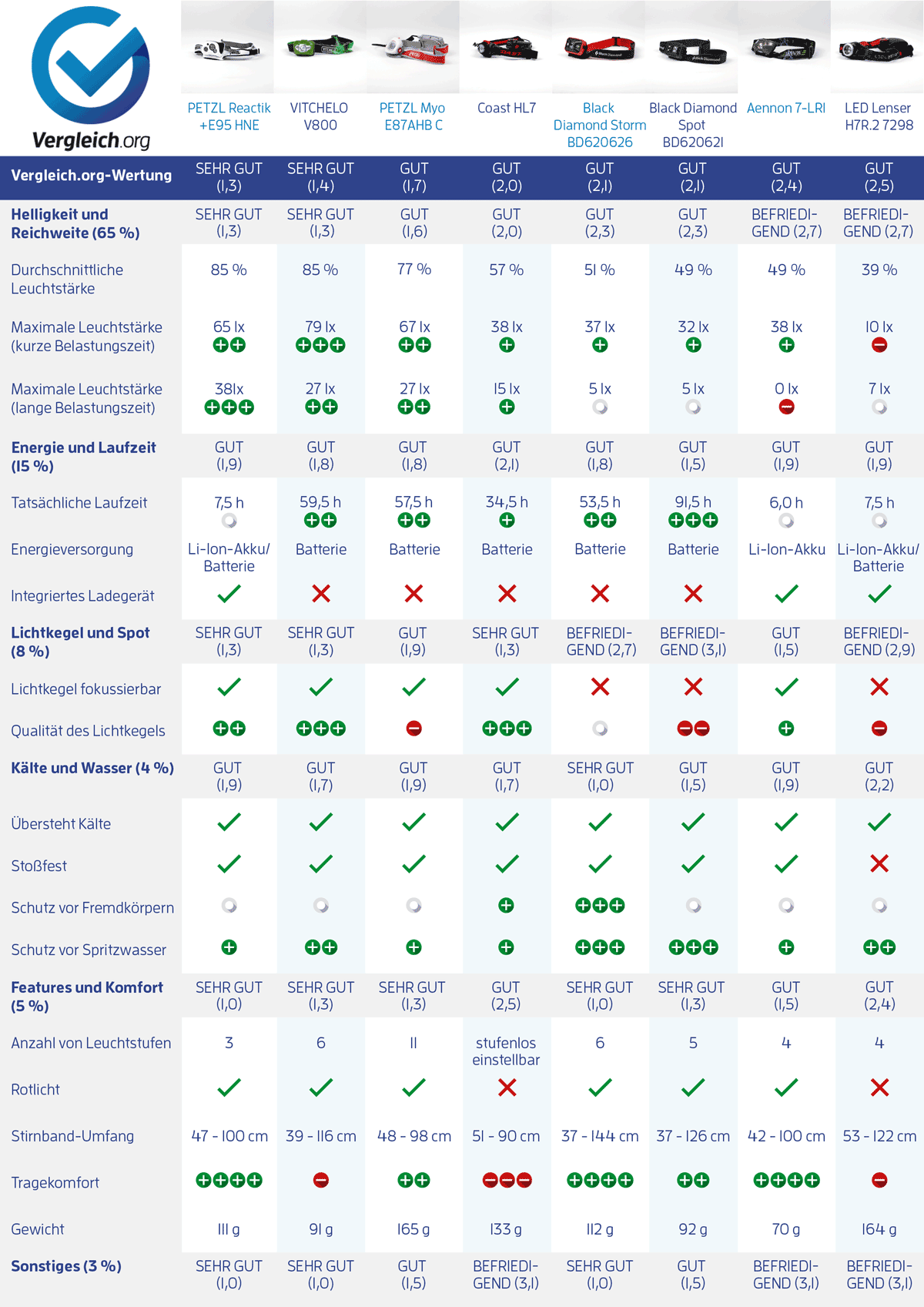 Hier finden Sie einen genauen Überblick über alle getesteten Kriterien sowie Informationen darüber, wie die Stirnlampen in den einzelnen Kategorien abgeschnitten haben: