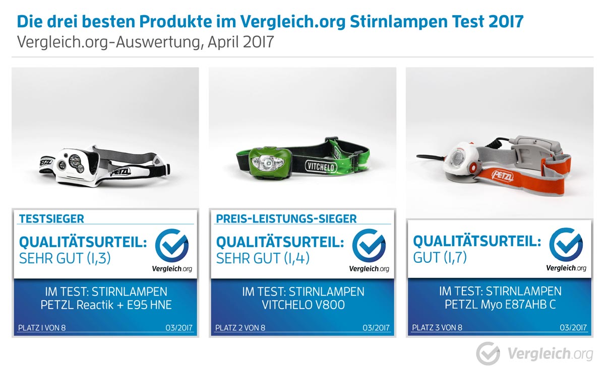 Testsieger Petzl Reactik+ und Preis-Leistungs-Sieger Vitchelo V800 demonstrierten ihre Überlegenheit und erzielten in dieser wichtigen Kategorie beide die Bewertung SEHR GUT (1,3).