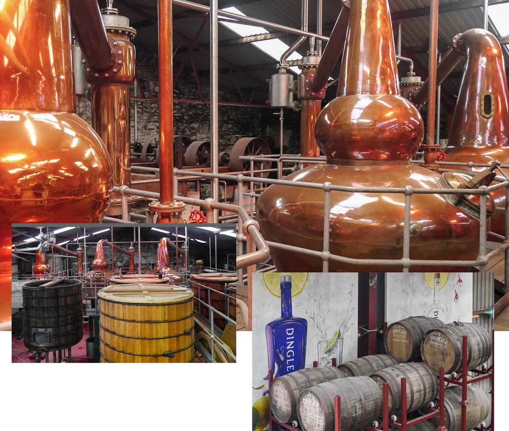Gar nicht gescheitert, sondern im Aufbruch befindlich ist dagegen die erst vor drei Jahren gegründete Dingle-Destillerie, in der neben dem Haupterzeugnis Whiskey auch Gin und Vodka hergestellt werden. Ich schaue mir die einfache Halle neben der ehemaligen Mühle an, in der mir der Prozess der Whiskey-Produktion von der Maische-Gärung bis zur Destillation in einfachen Schritten erläutert wird. Auch die Möglichkeit, in einem mehrtägigen Kurs den Destillationsprozess selbst zu erlernen bietet sich mir hier.