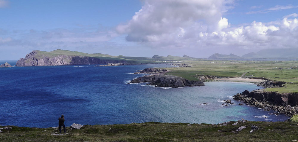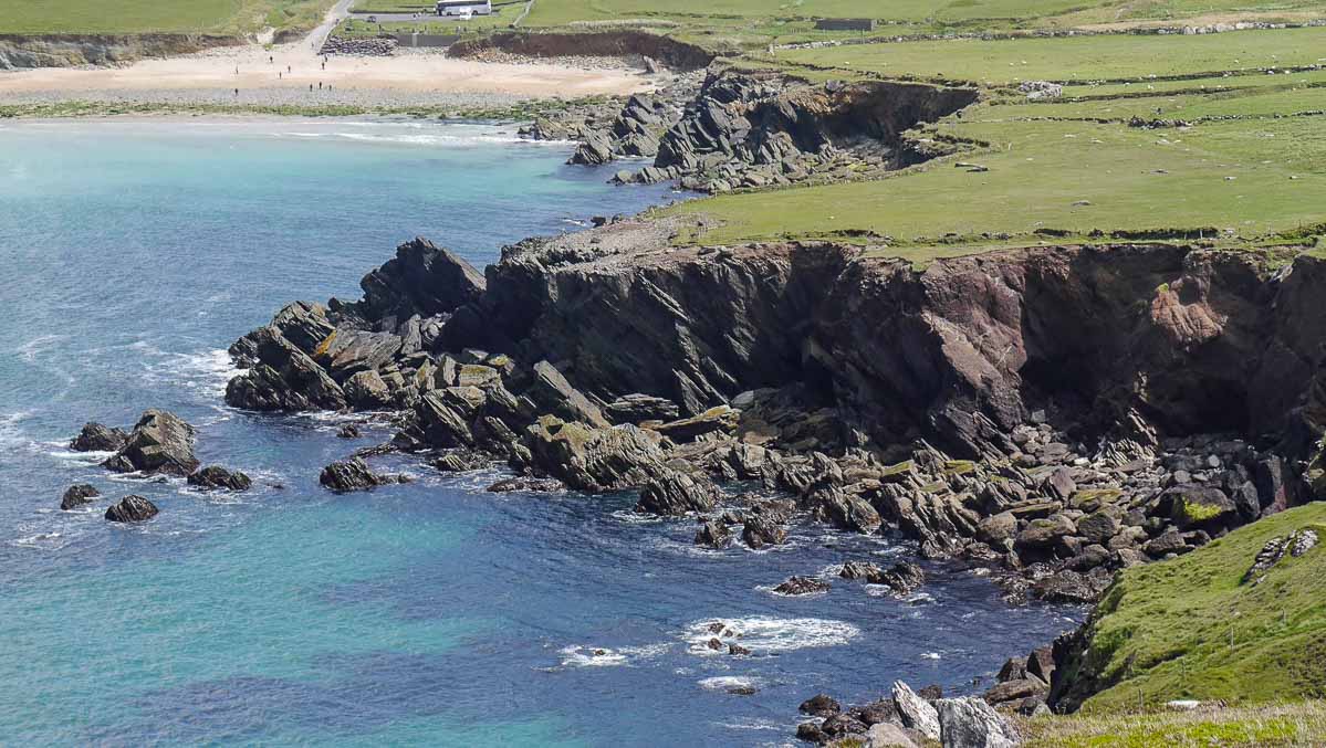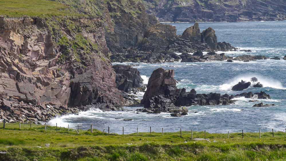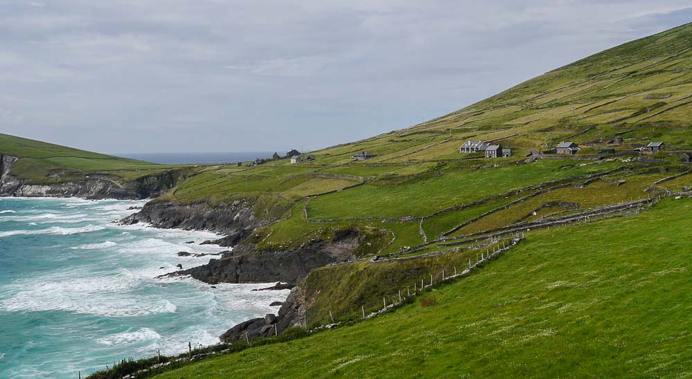 Schroff und steil abfallend schieben sich die Klippen in die weiß schäumende Gischt der Ufer-Brandung hinein und erzeugen einen imposanten Gegensatz zu den sonst friedlich komponierten Elementen dieses eindrucksvollen Bildes vom Ende der Welt. Irland im Westen. Kerry, die Gegend um den kleinen, quirligen Ort Dingle ist es, die ich auf dem Wild Atlantic Way erkunde. Die bis zu den Klippen vorgezogenen, grünen Matten aalen sich im Schein der Julisonne und harmonisieren mit dem tiefen Blau des Atlantiks, der sich in Wellen an den Steilufern bricht.Weiße, fast schon karibisch anmutende Strände durchbrechen die Klippenlandschaft hier und da. Kleine, vollkommen aus Stein gebaute Kotten lockern die sattgrüne Landschaft auf durch ihre wie zufällig angeordnete Platzierung und überall entdecke ich kleine, weiße Punkte, die sich bei näherem Herangehen als den schier unerschöpflich erscheinenden Bestand an Schafen herausstellen. Lange könnte ich diese Landschaftsbeschreibungen fortsetzen, die mir an diesem sommerlichen Tag allerorts auf meine Fahrt begegnet. Denn Irland lebt gerade in dieser Gegend von seiner rauen, gegensätzlichen und atemberaubenden Landschaft. Dabei habe ich noch Glück, einen der 100 Tage im Jahr erwischt zu haben, an denen es nicht regnet in dem mit 250 Regentagen bescherten Irland.
