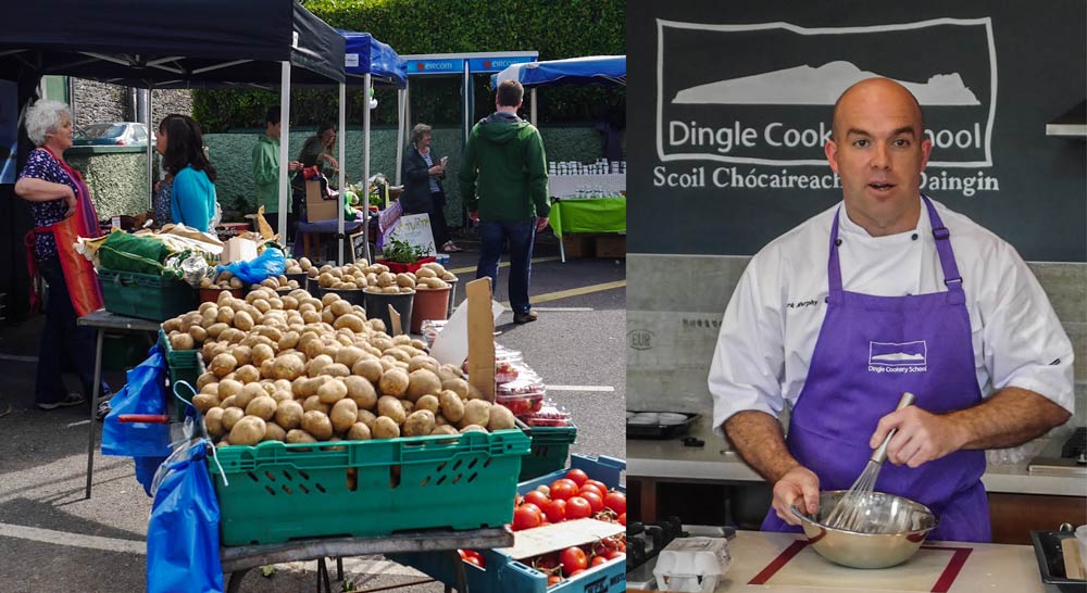 Eigentlich gibt es in Dingle nichts, was historisch wertvoll oder sehenswert wäre. Aber der Ort hat dennoch viel zu bieten, vor allem kulinarisch. Denn die breite Vielfalt an Restaurants unterschiedlicher Klassen ist mindestens ebenso bemerkenswert wie der Umstand, dass Dingle über eine Whiskey-Destillerie und eine Brauerei verfügt. Und so beschließe ich, diesen Ort kulinarisch zu erkunden. Eine Kochschule wäre jetzt passend. Wie gut, dass ich Mark Murphy treffe, der als Koch und kulinarischer Botschafter Irlands ansonsten Küchenchefs ausbildet an der Universität von Tralee und hier in Dingle eine Kochschule zusammen mit Martin Bealin betreibt. Was ich koche, muss ich mir zunächst im Ort beschaffen.